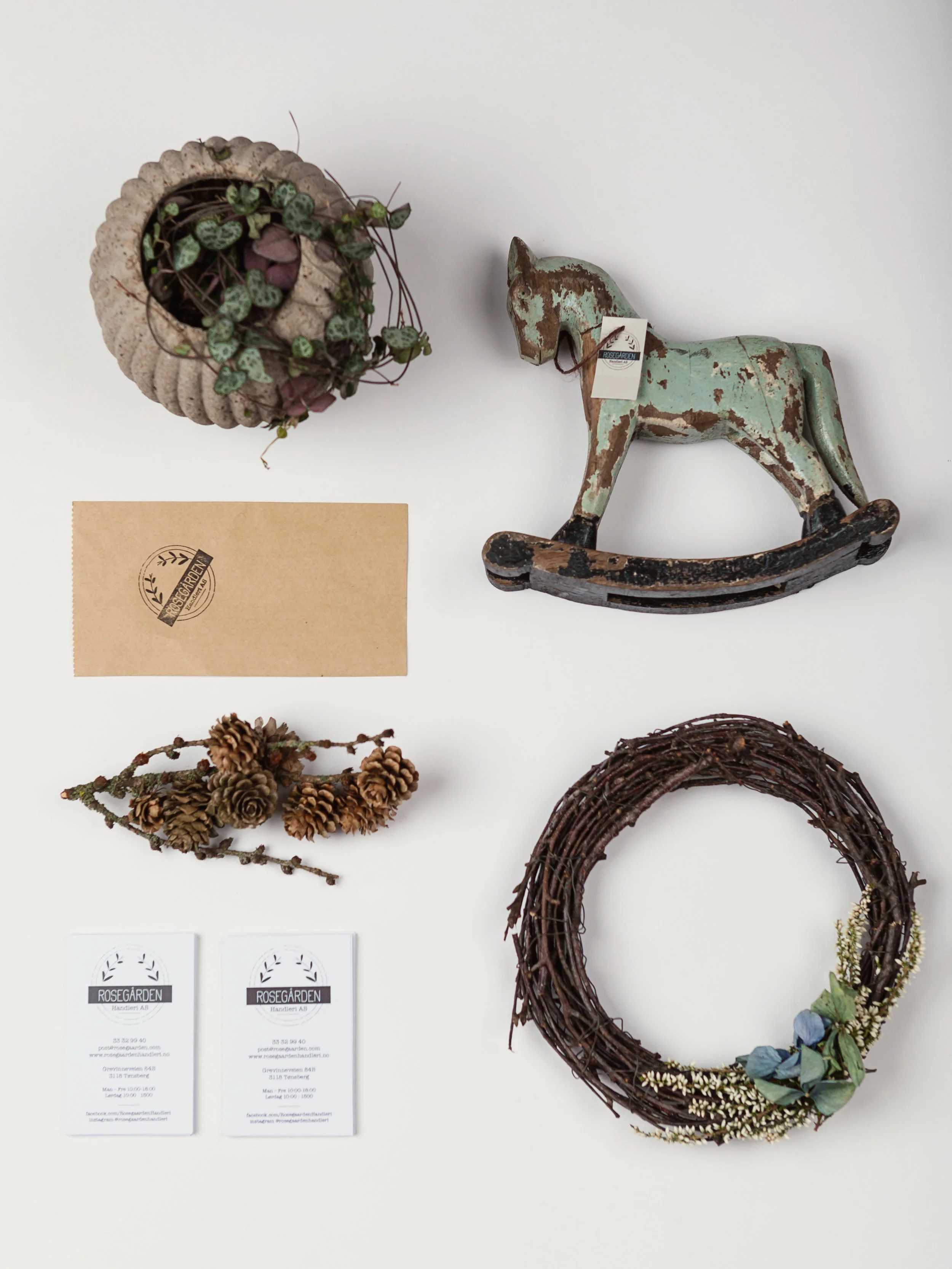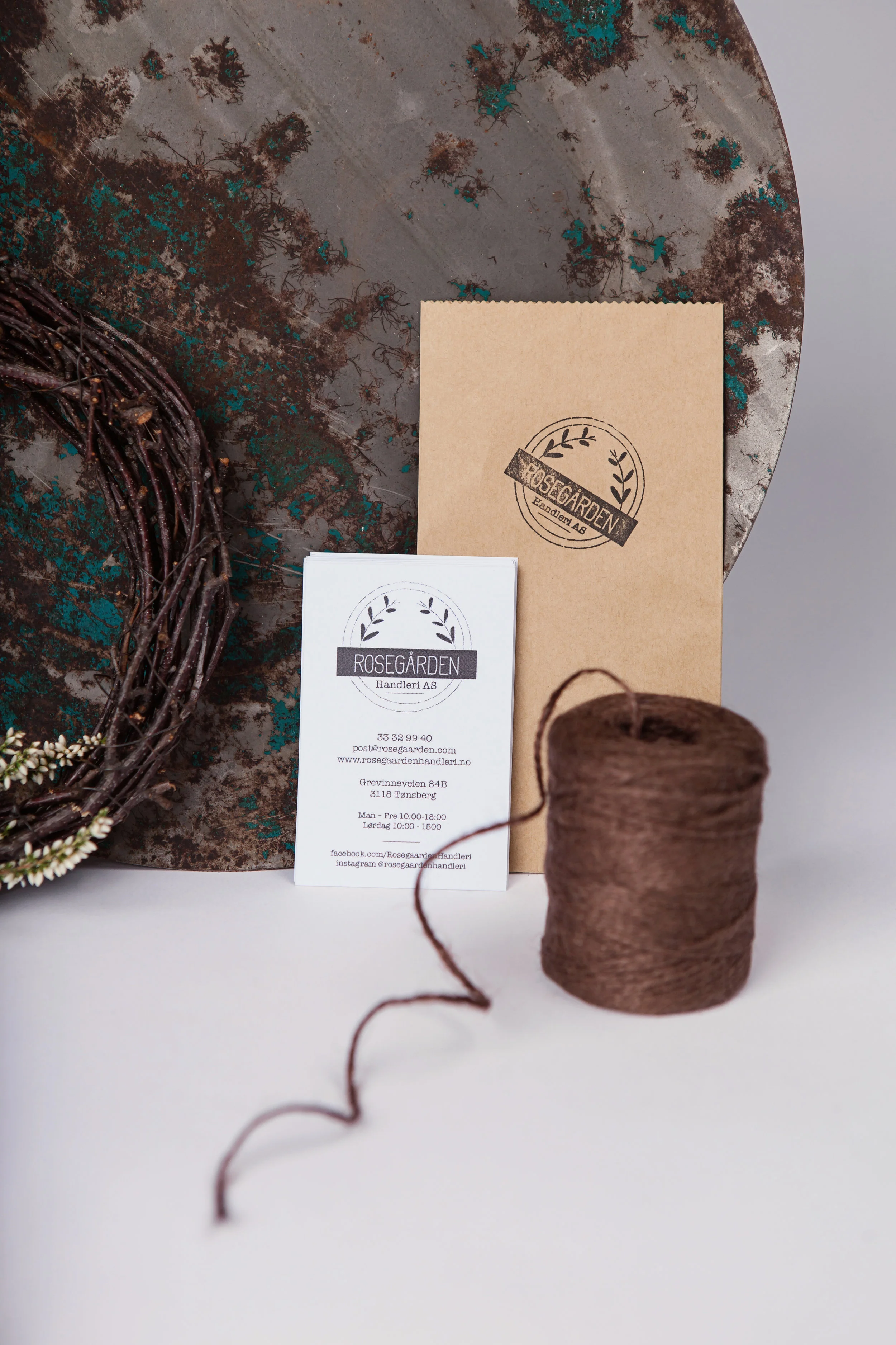 Rosegården Handleri Logo for blomster og gavebutikken Rosegården Handleri i Tønsberg. På Rosegården lager og pusser de opp mye ting for hånd, så det var en idé at også logoen skulle se håndlaget ut. Rosegården skriften er derfor håndtegnet.