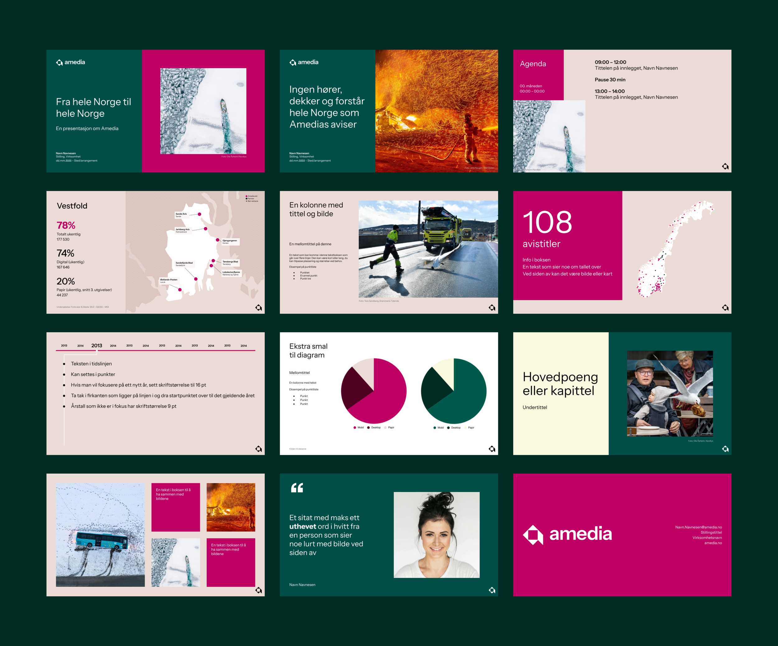 Sammen med kollega Helene R. Andersen har jeg designet og utviklet Amedias nye presentasjonsmaler i Google Presentasjoner. Dette inkluderer både en omfattende grunnmal som skulle treffe en rekke behov fra Amedias ulike avdelinger, en forenklet utgave og en omfattende «verktøykasse» med spesialtilpassede oppsett for blant annet statistikk, tidslinjer, bildebruk og slides med kart og talldata relatert til dekningsområder for Annonseavdelingene. Jeg har også hatt hovedansvaret for organisering og mappestruktur for alt profilmateriell på konsernets delte flater i Google disk.