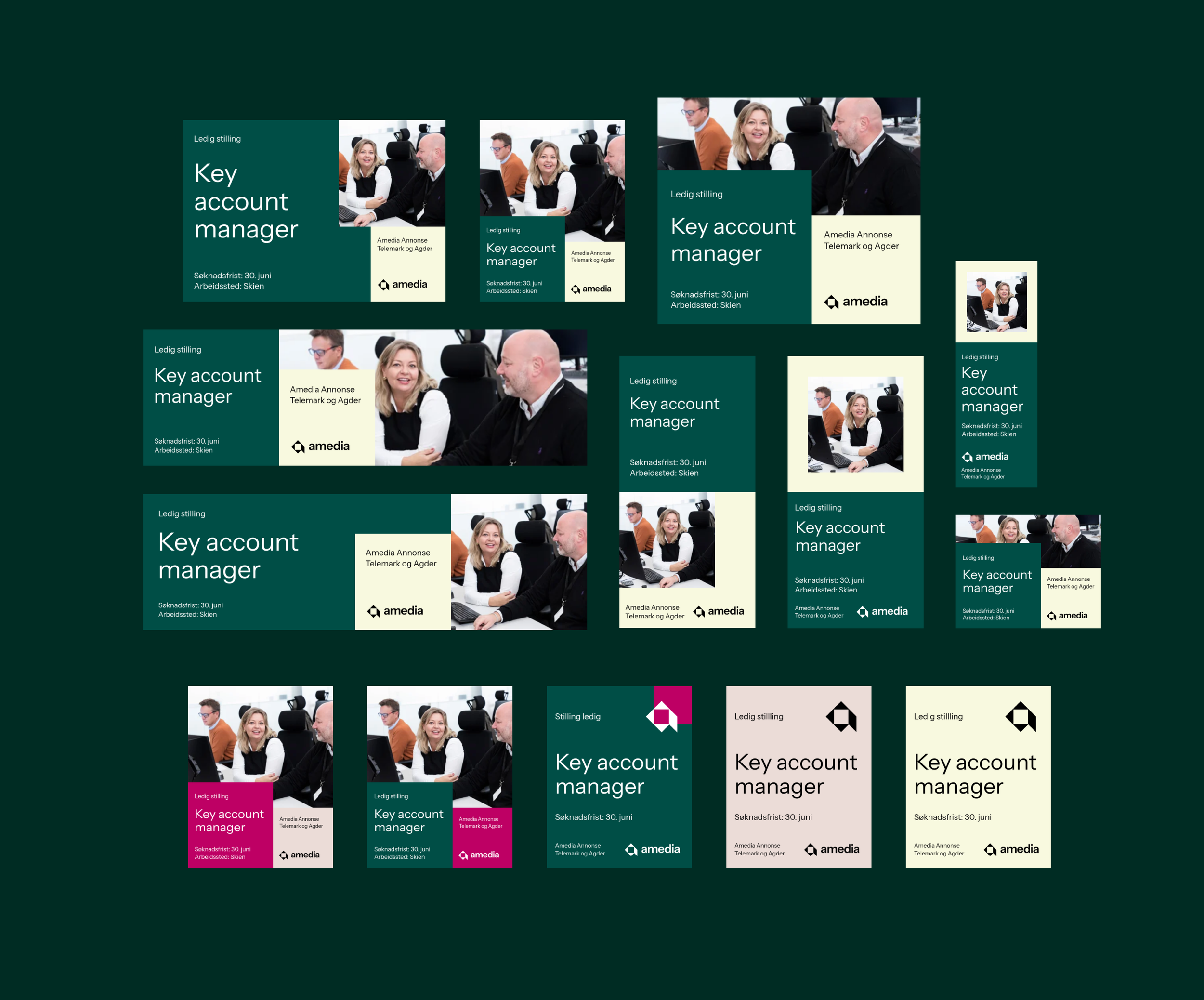 Malverk for digitale stillingsannonser med utgangspunkt i designutkast fra Try. Annonsene er satt opp i flere formater for ulike flater, med fleksible løsninger for bruk med og uten bilde i ulike fargevarianter. Arbeidet sikrer en profesjonell og konsekvent profilering av Amedia som arbeidsgiver.